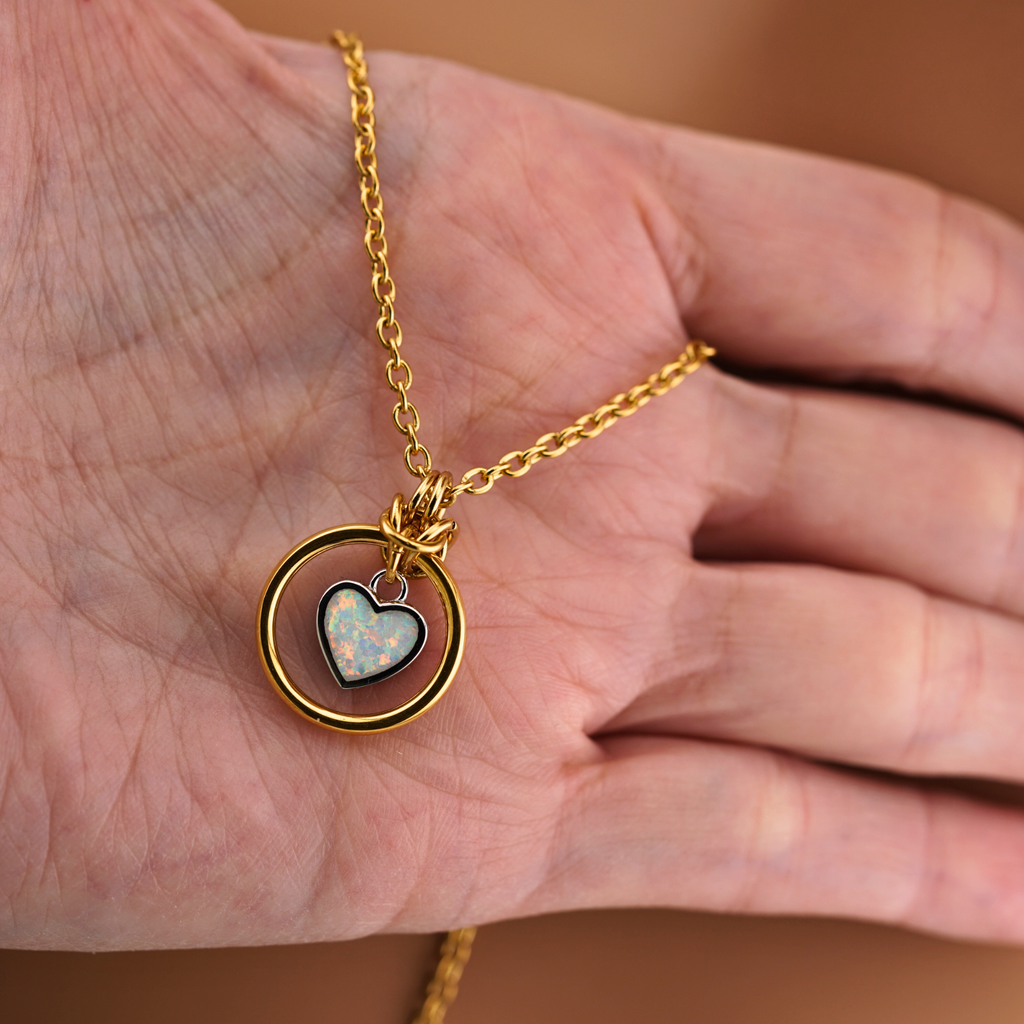 The necklace features a luminous opal-style heart symbolizing devotion and connection, paired with a classic O-ring for subtle kink expression. Thoughtfully designed for those who appreciate beauty with deeper meaning, it balances intimacy and everyday elegance.