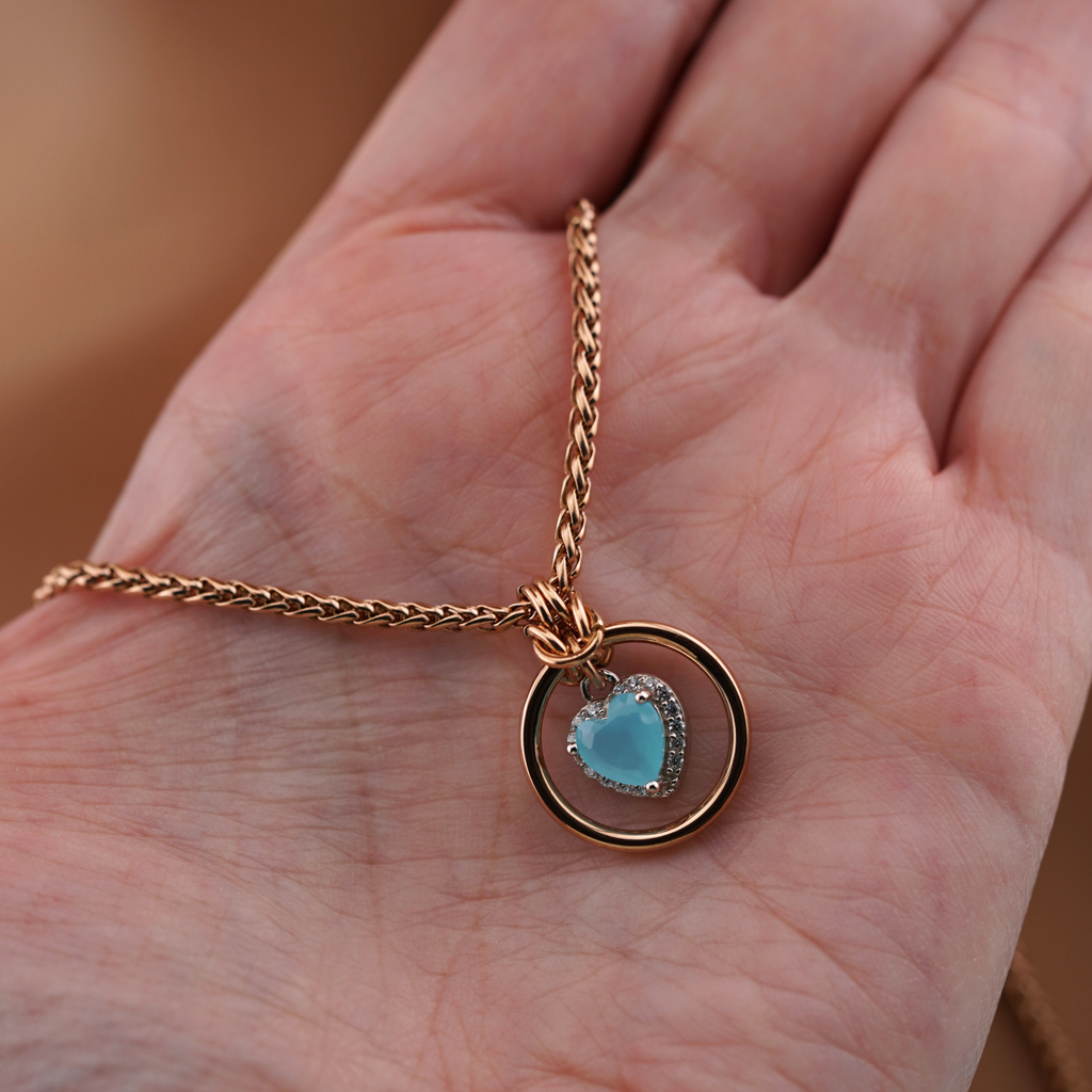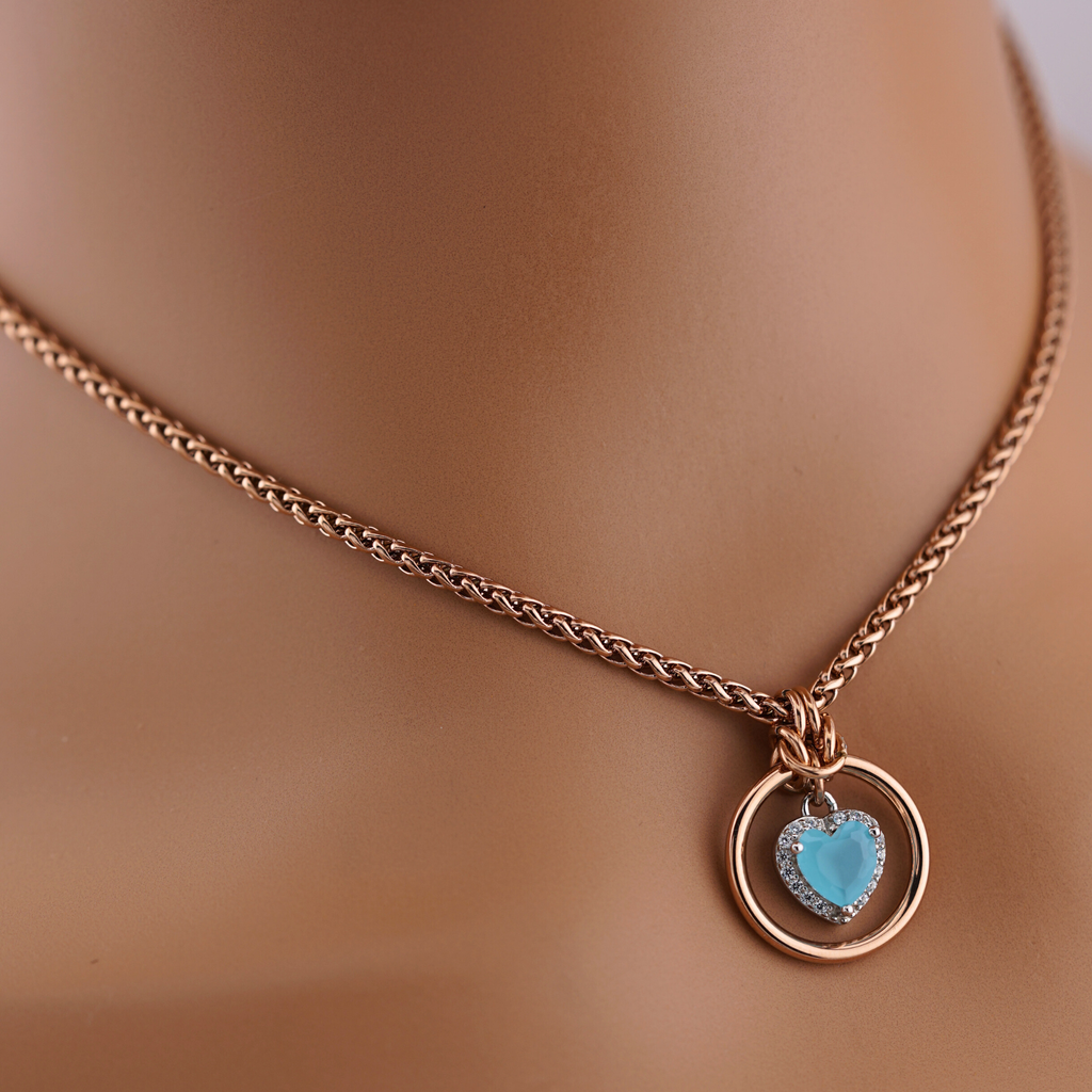 A rose gold plated O-ring with a  chainmaille accent holds a sterling silver heart set with a milky blue CZ stone. Finished on a rose gold plated stainless steel wheat chain, this collar is both sentimental and stylish.