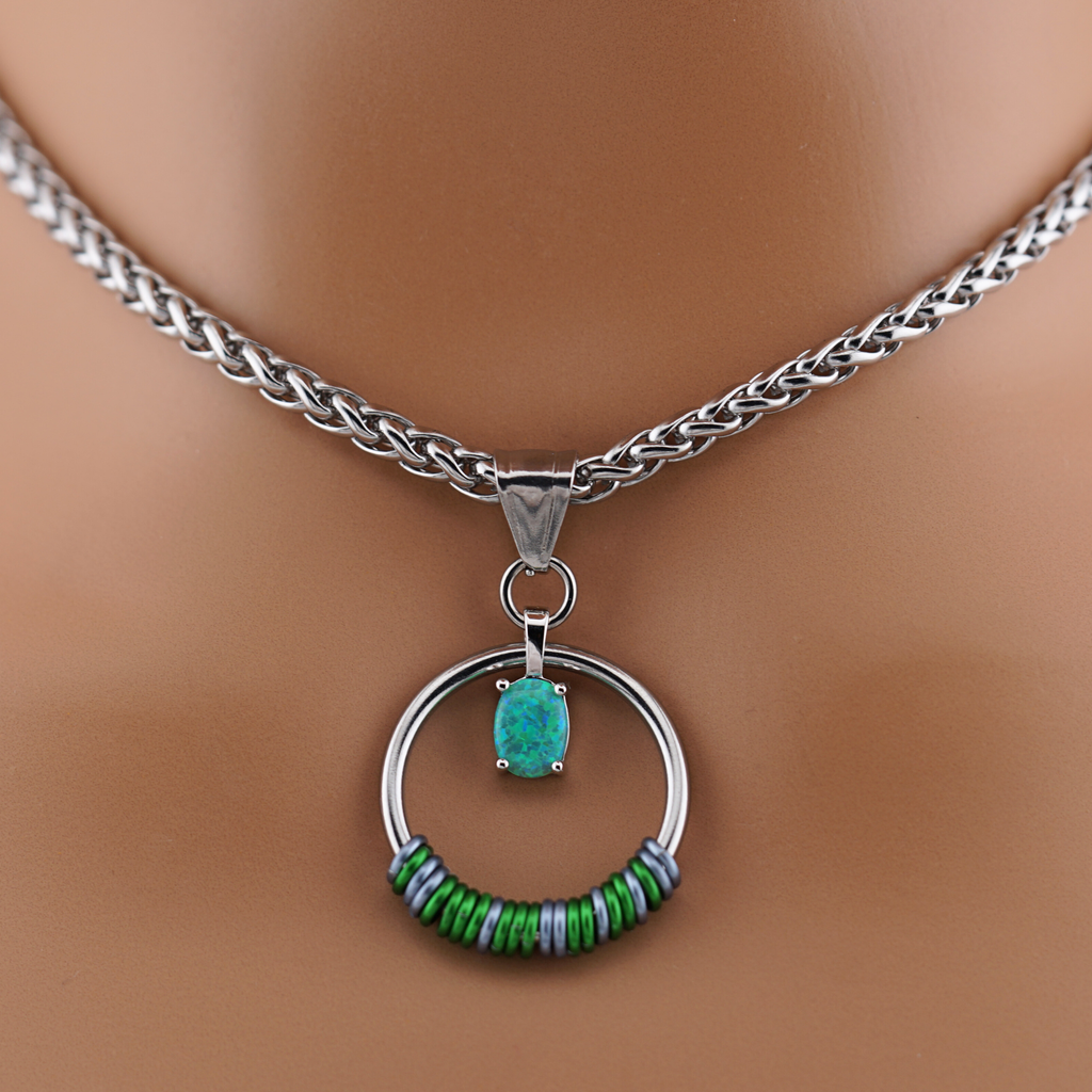 A glowing green faux opal adds a teasing pop of color, while the classic O-ring design keeps the piece rooted in subtle BDSM symbolism. It looks like jewelry… but it says so much more.