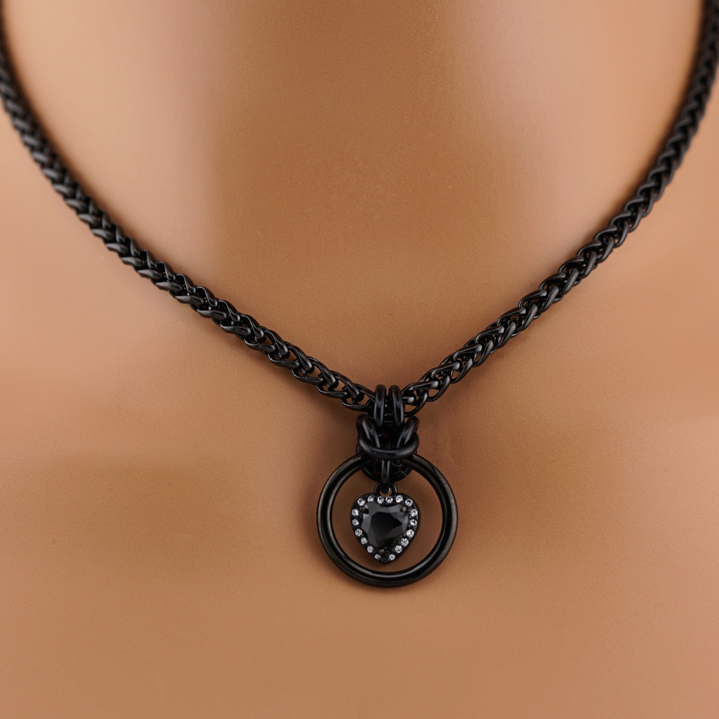 Surprise your submissive or partner with this striking handcrafted day collar, designed to balance intimacy, elegance, and quiet symbolism. Perfect for Valentine’s Day, anniversaries, or just because, this piece features a black heart surrounded by clear CZ stones, framed within a bold black O-ring and finished with an all-black hand-woven chainmaille accent.
