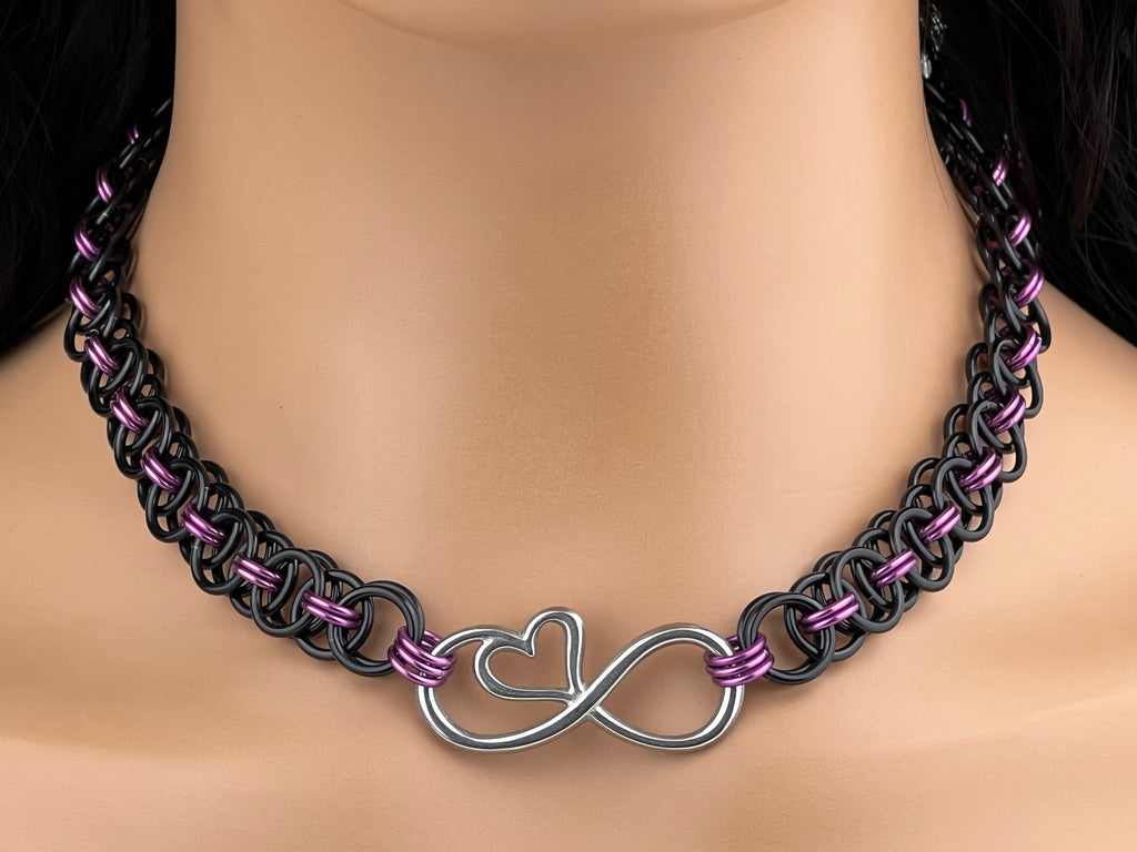 Elevate your submissive style with this stunning Infinity Heart Day Collar, featuring an elegant Helm weave chainmaille design. Handwoven one ring at a time, this collar is a true symbol of craftsmanship, care, and connection.