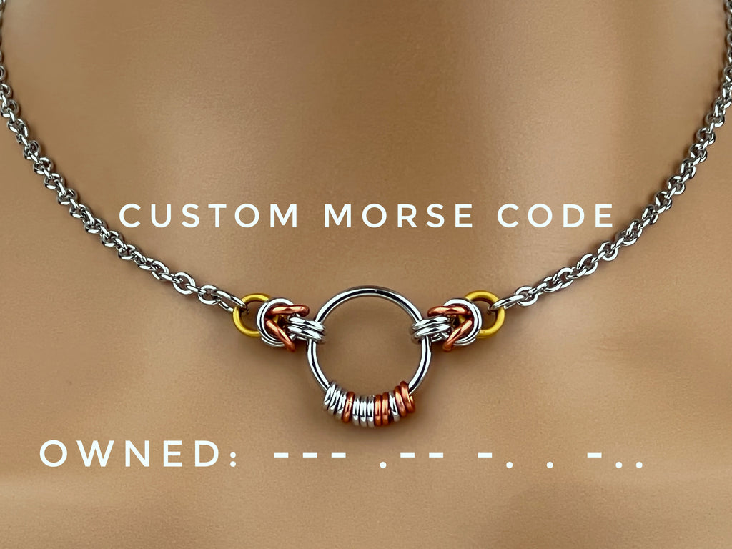This Morse Code BDSM O-Ring necklace is a subtle yet powerful symbol of connection and intention. Designed as a discreet submissive day collar, it blends minimalist style with hidden meaning—perfect for everyday wear.
