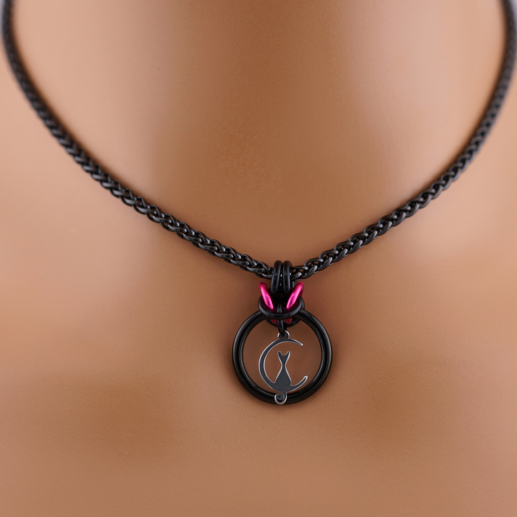 This kitten day collar is designed for submissive wearers who love a soft, witchy aesthetic with meaningful symbolism. It features a thicker wheat chain that still feels feminine and elegant on the neck. A chainmaille accent in your chosen color adds a gentle decorative touch, leading to a classic BDSM O-ring adorned with a silver kitten resting on a crescent moon—perfect for kitten play, moon lovers, and those drawn to magical, lunar themes.