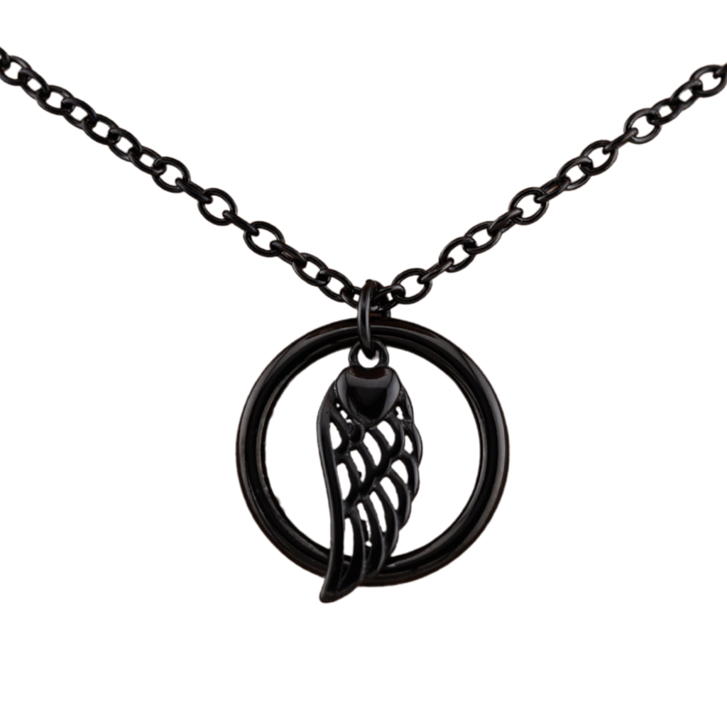 O-Ring: 18mm seamless black stainless steel with centered black angel wing and heart charm