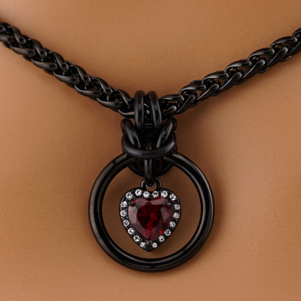 Surprise your submissive or partner with this striking handcrafted day collar, designed to balance intimacy, elegance, and quiet symbolism. Perfect for Valentine’s Day, anniversaries, or just because, this piece features a deep garnet heart surrounded by clear CZ stones, framed within a bold black O-ring and finished with an all-black hand-woven chainmaille accent.